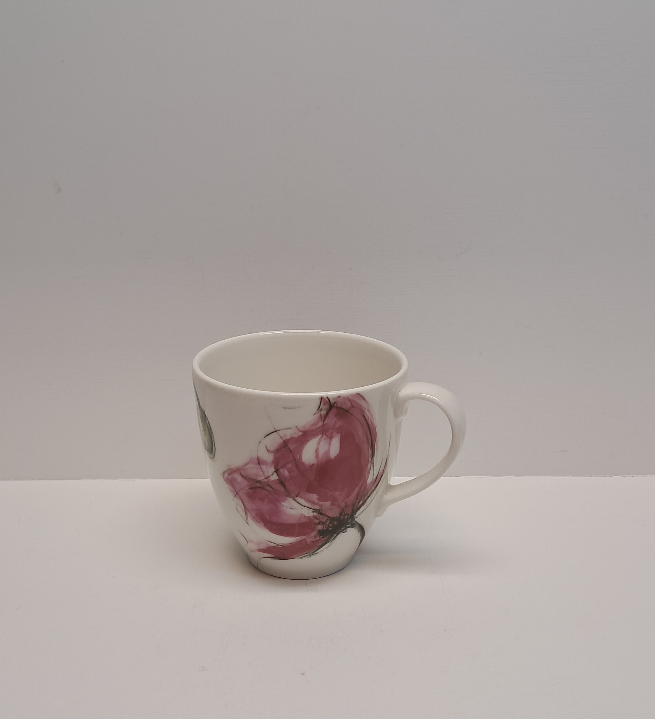 Mukin korkeus 9,5 cm, suuaukon halkaisija 9 cm. Kunto hyvä, vähäistä käyttökulumaa.