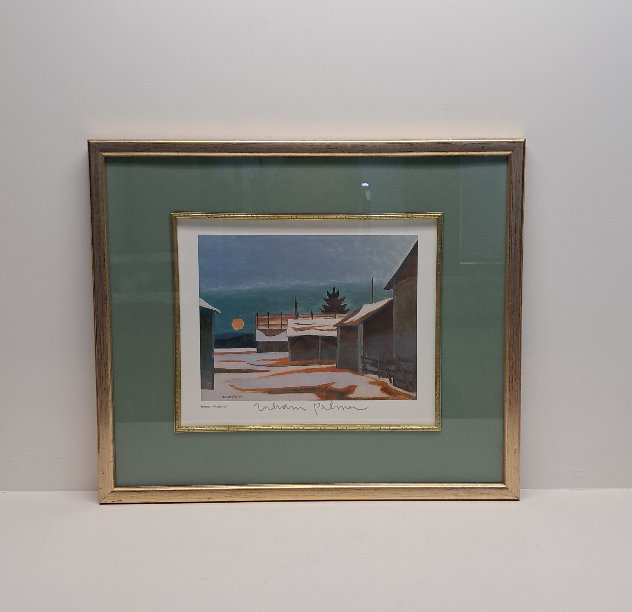 Taulu Juhani Palmun teoksesta Sininen hiljaisuus. Kehyksen mitta 33,5 x 28,5 cm, kuvakoko 17 x 13 cm. Signeerattu.